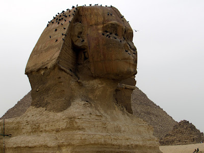 From the Great Pyramids we drove downhill a short distance to view the famous Sphinx, a different experience altogether. The Sphinx cannot be approached very closely, and there is scaffolding for restoration work. And after the immense presence of the Pyramids, it feels almost small..